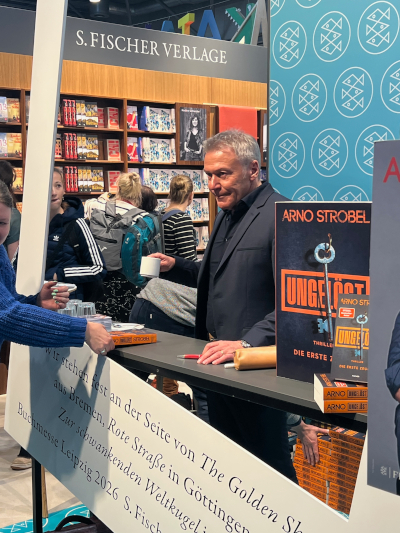 Auf dem Weg zu unserem ersten Vortrag kamen wir beim Stand von Fischer Sauerländer vorbei, wo Arno Strobel gerade sein neues Buch, den Auftakt zu einer neuen Thriller-Serie, signierte.